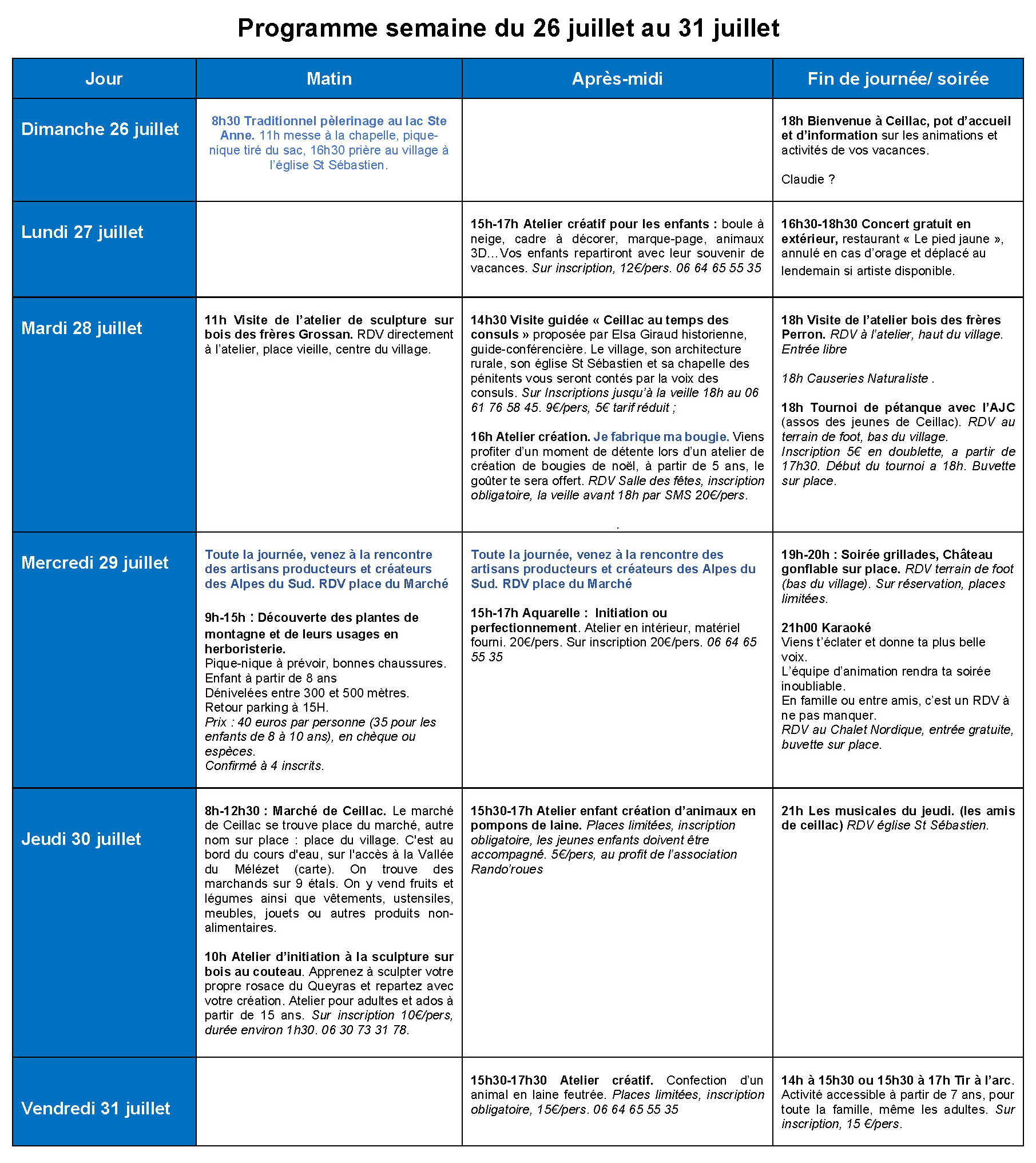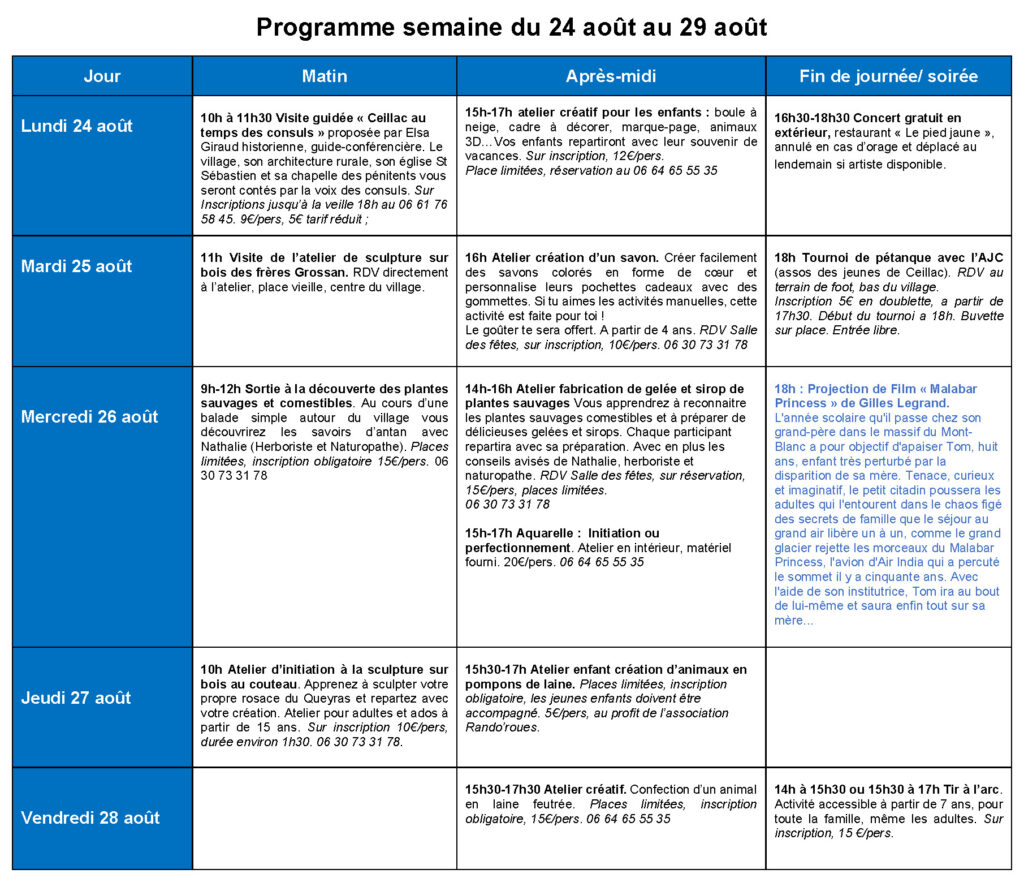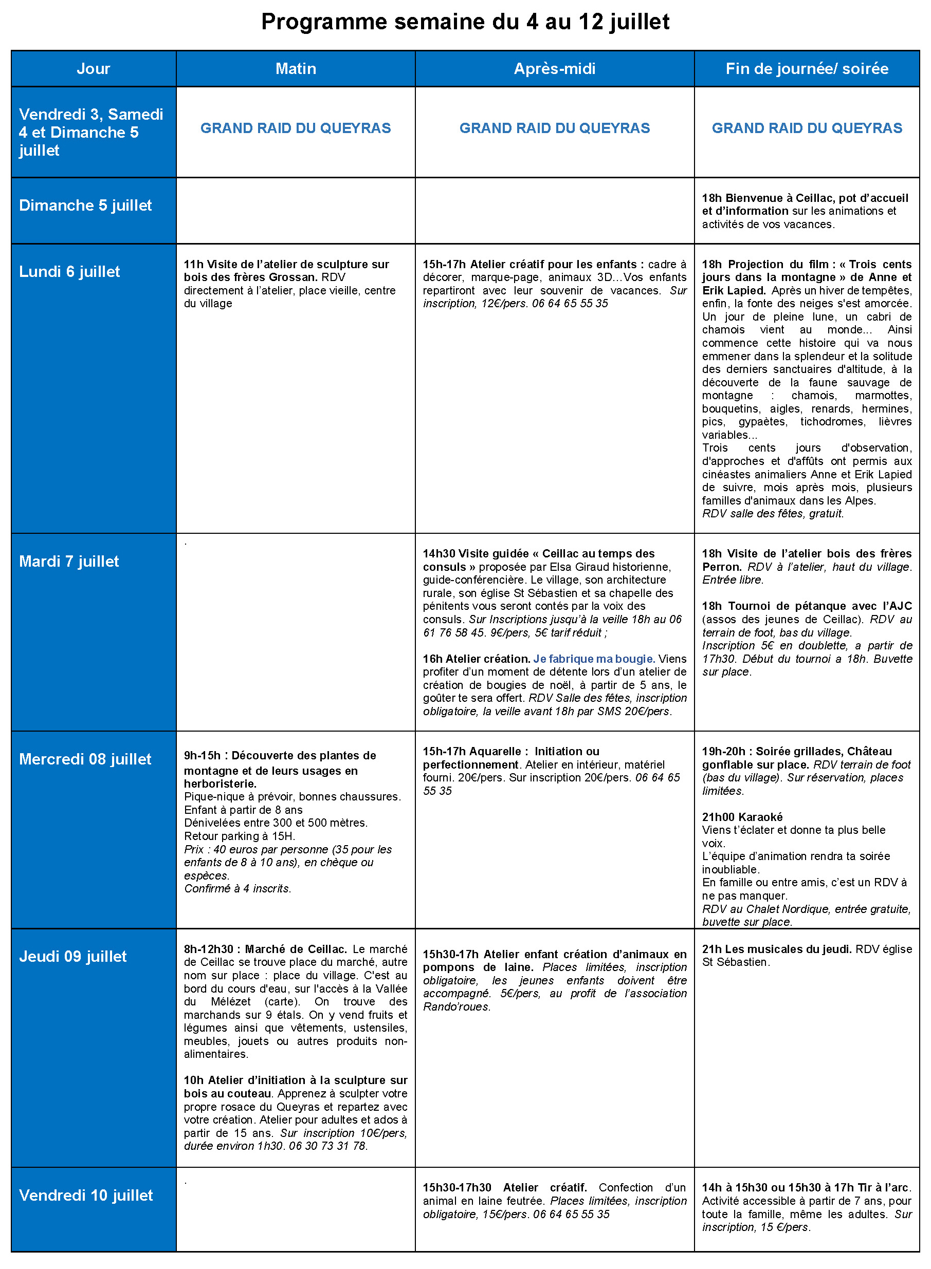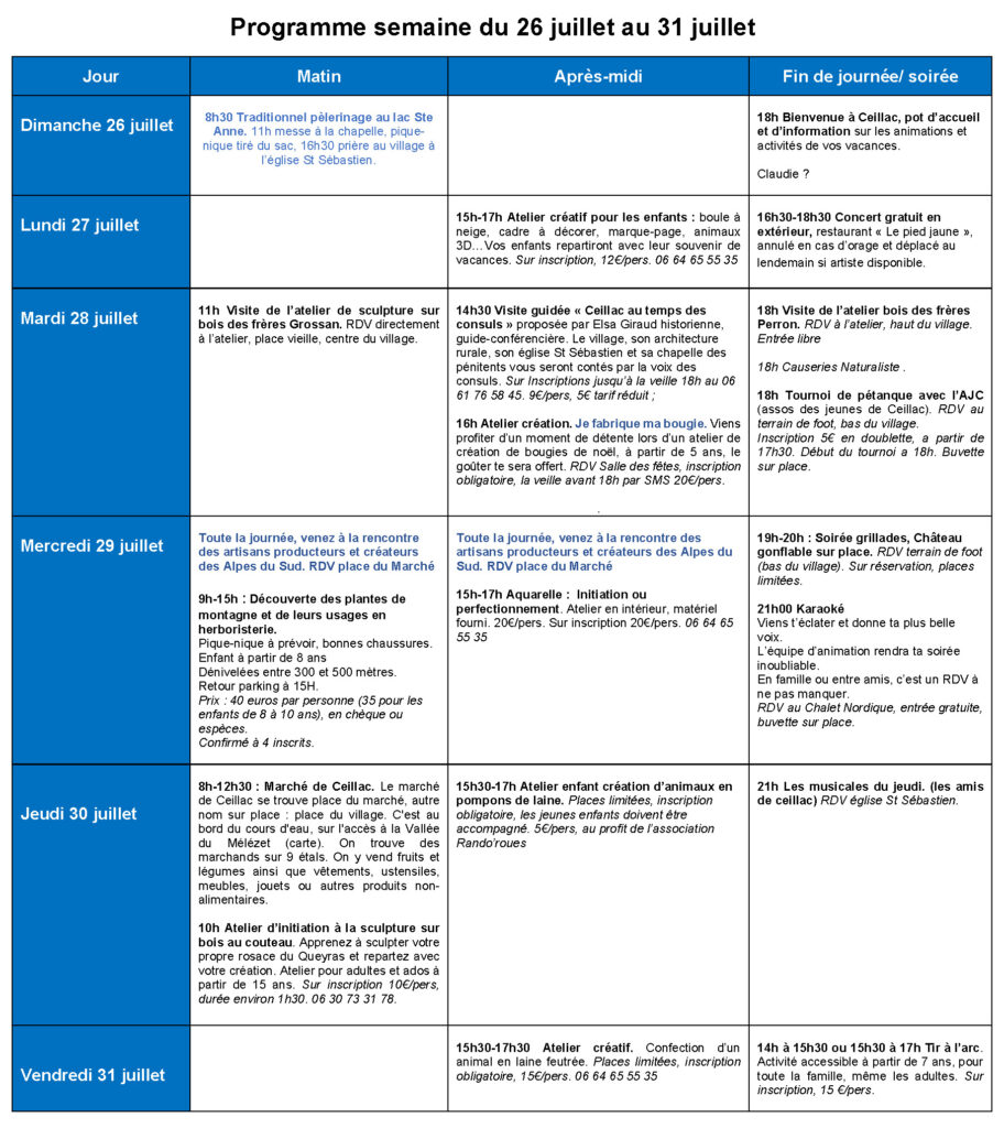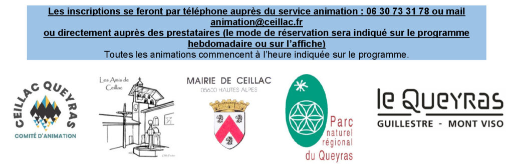 Nous avons le plaisir de vous présenter le programme des animations de cet été 2026 sur Ceillac. Ce programme reprend les différentes animations proposées par le comité des fêtes, l’association « Les Amis de Ceillac » et les Consom’acteurs de l’Office de Tourisme. Il est donné à titre informatif et pourra connaître des modifications.