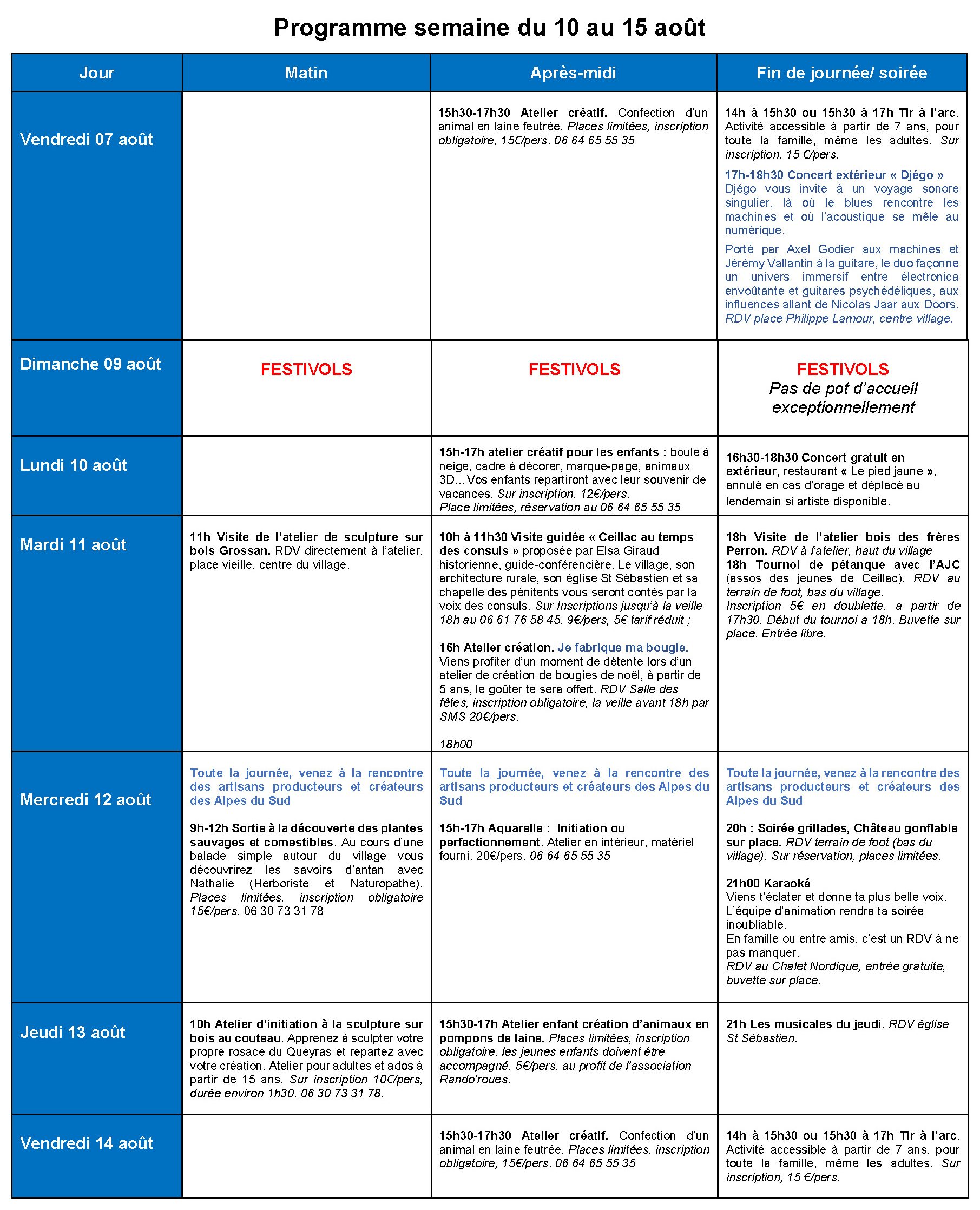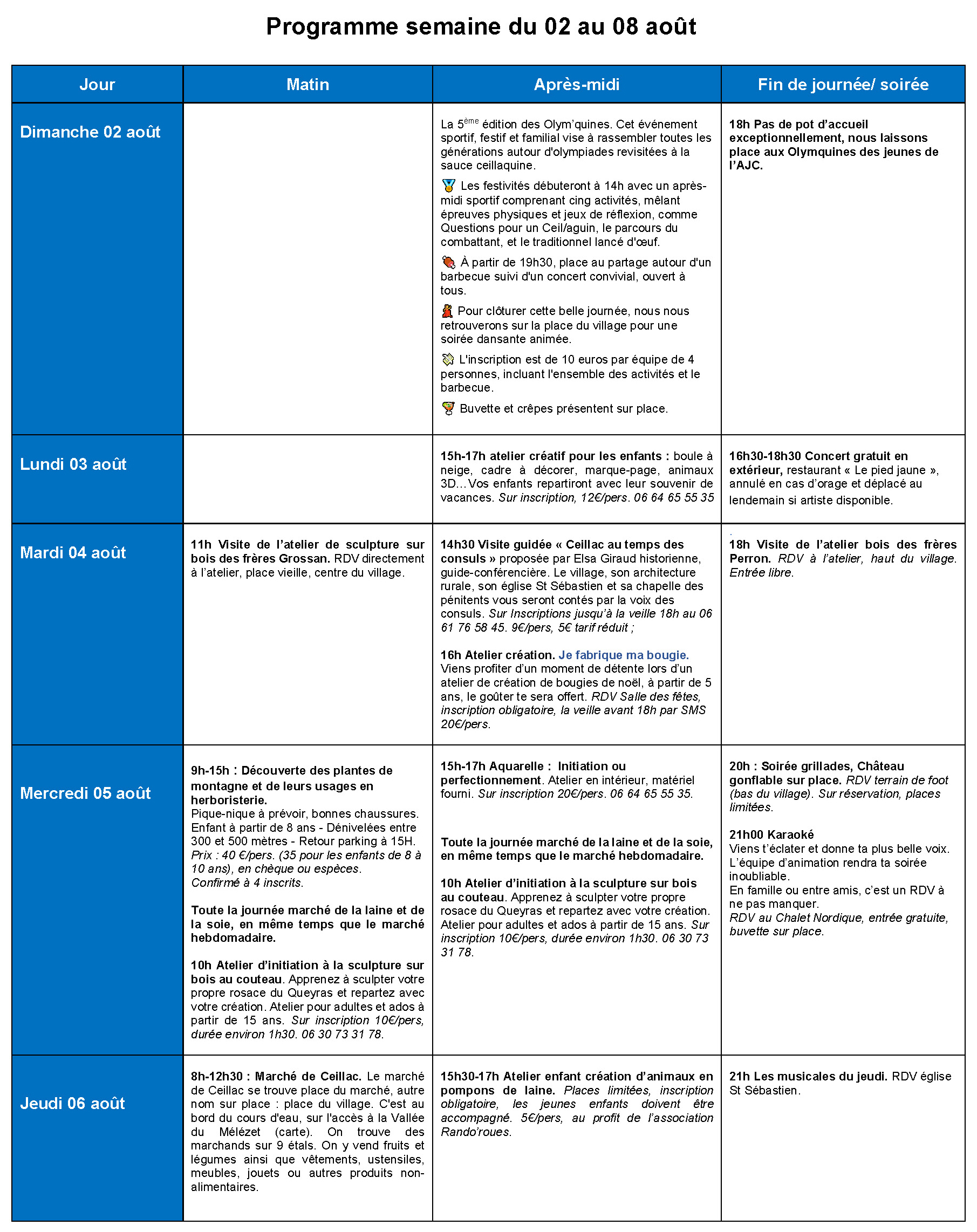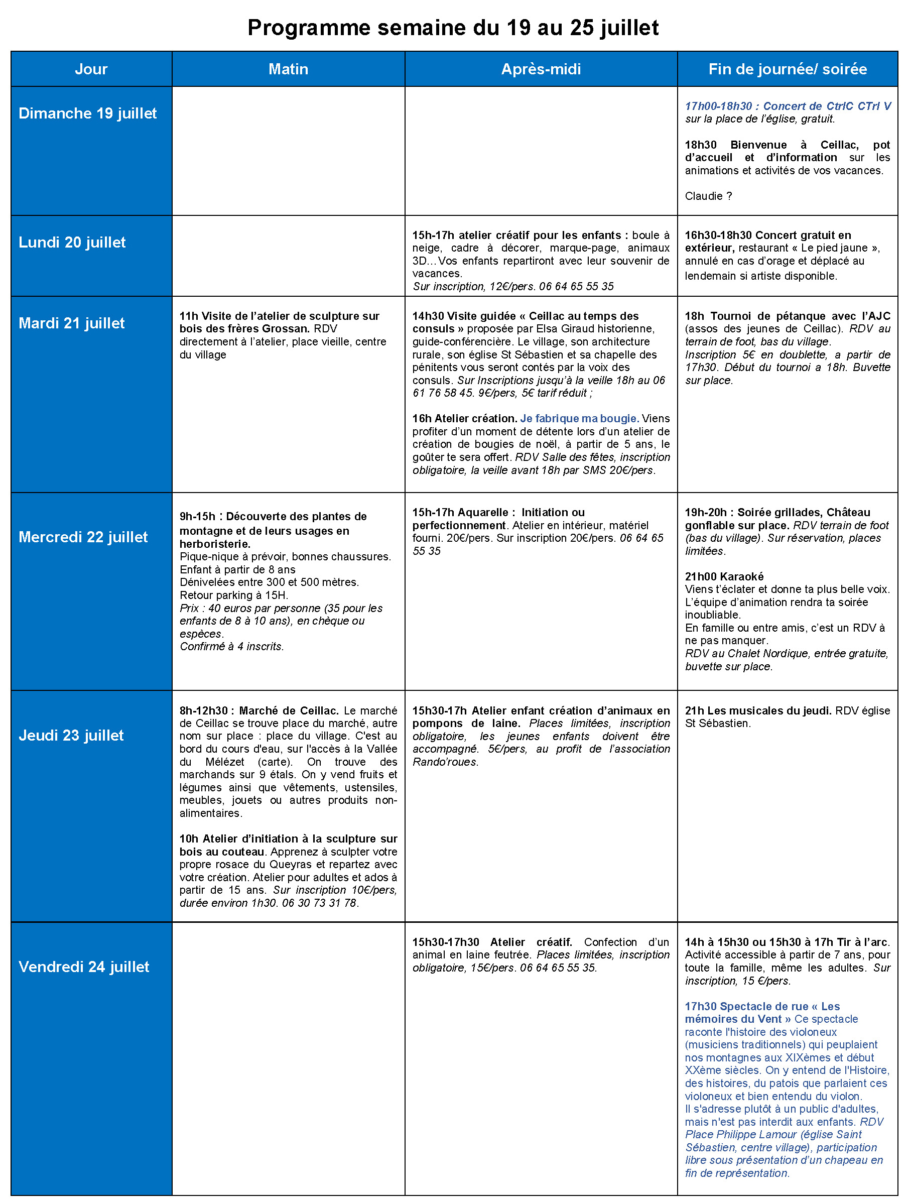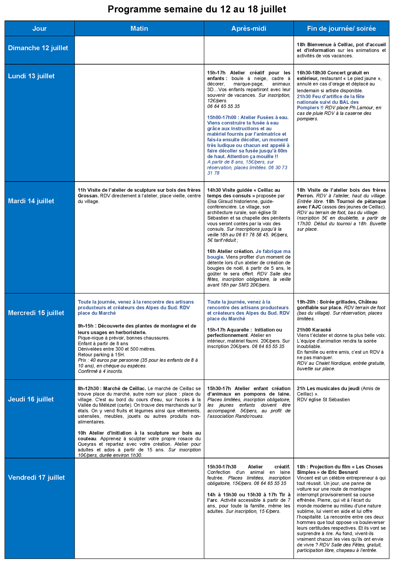 Nous avons le plaisir de vous présenter le programme des animations de cet été 2026 sur Ceillac. Ce programme reprend les différentes animations proposées par le comité des fêtes, l’association « Les Amis de Ceillac » et les Consom’acteurs de l’Office de Tourisme. Il est donné à titre informatif et pourra connaître des modifications.