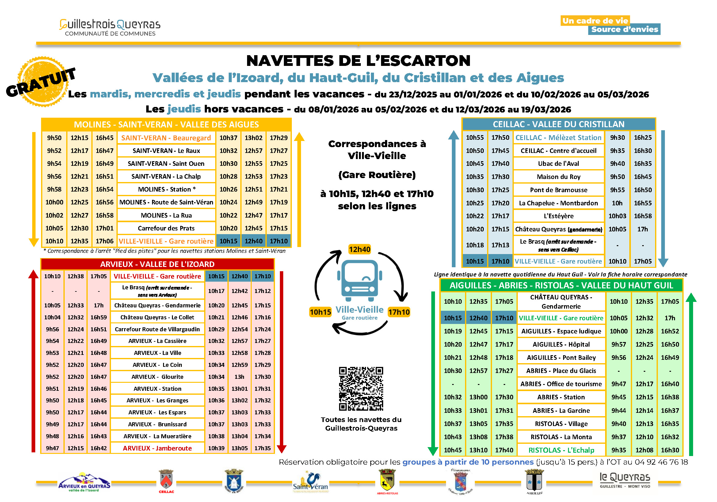 Les navettes inter-villages vous permettent, l’été et l’hiver, de vous déplacer entre les différentes vallées du Queyras. L’été, les navettes desservent la vallée du Mélezet jusqu’à Chaurionde.
